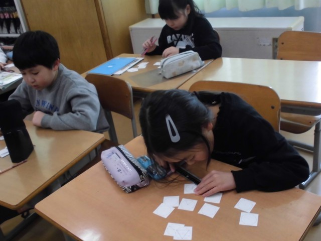3つの点をつないで、いろいろな三角形を描き、辺の長さに着目して、グループ分けをしました。