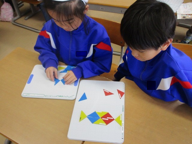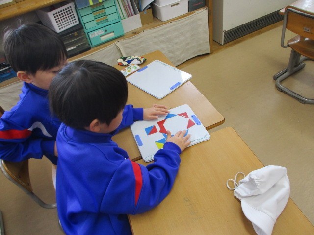 三角形の色板を使って、ヨットや手裏剣、家といった形をつくりました。自由につくる時間には、様々な形に見立ててつくる姿が見られました。