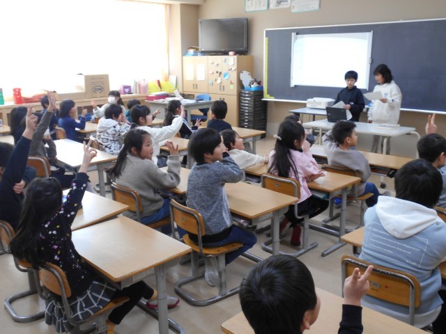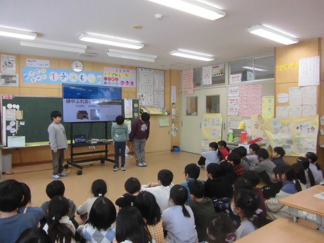 3年生が総合的な学習の時間に調べたことを発表してくれました。「大きな声ではきはきと発表していてすごい!」「1人が話す量が私たちより多い!」など、速星自慢での自分たちの発表と比べて発表を聞きました。3年生になってからの学習が楽しみになった2年生でした。