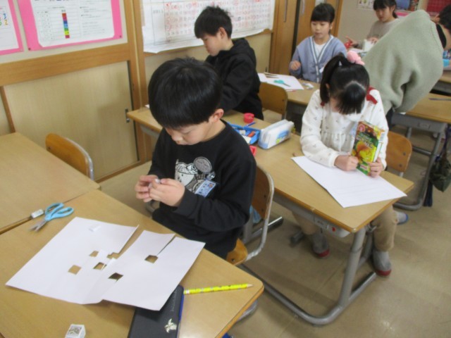 算数科の学習では、箱の形を画用紙に写し取っています。面の数や辺に注目して組み立てる活動を通して、箱の形の構成要素を学んでいます。