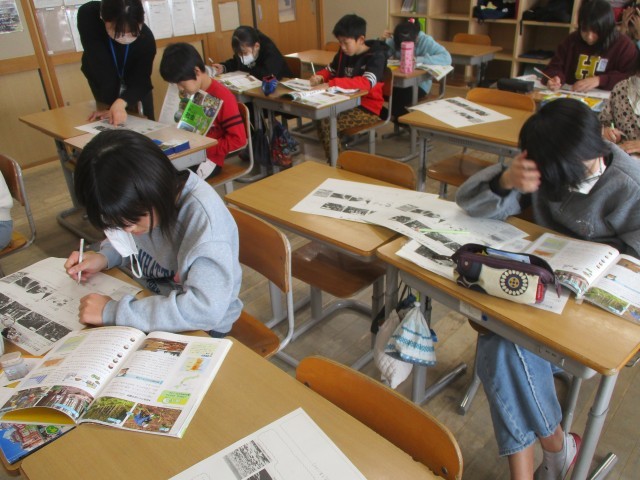 社会の時間では、林業について自分たちで調べ活動を行いました。教科書や資料集を使いながら必要な情報を選んでいました。