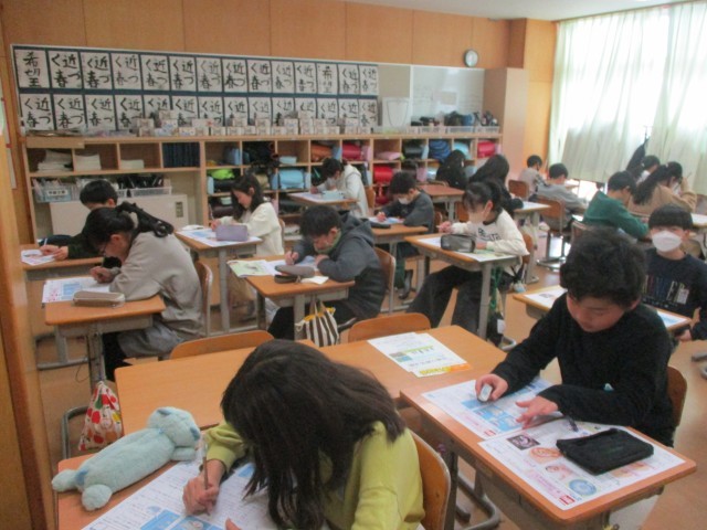 5年生 理科 人のたんじょう 物のとけ方 公開日 2025/03/02 更新日 2025/02/28 5年生 理科のカラーテストをしている様子です。学習のたしかめも近づいており、普段のテストもより一層集中していました。