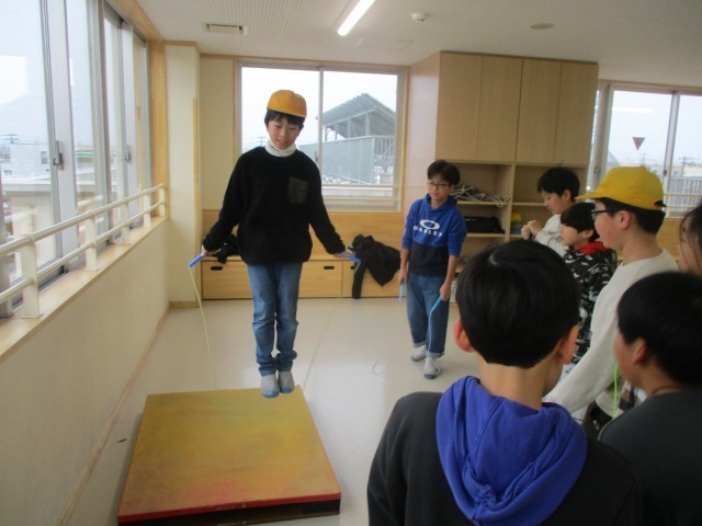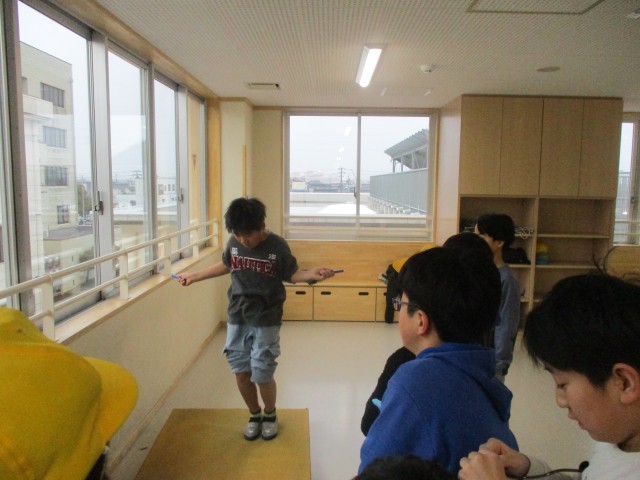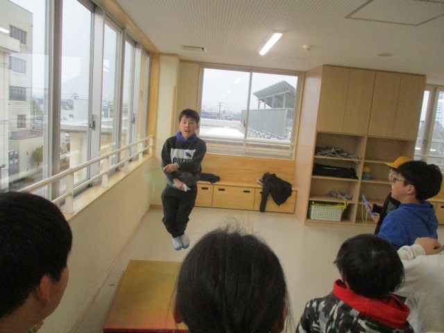 廊下になわとび用のジャンプ版があります。子供たちは上手になりたい技を練習していました。