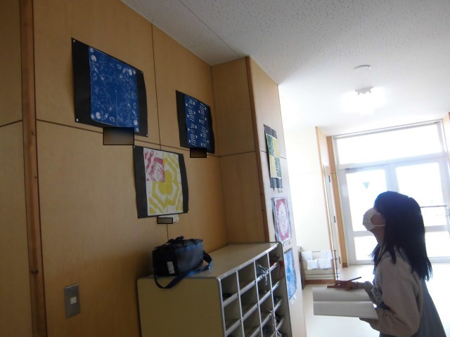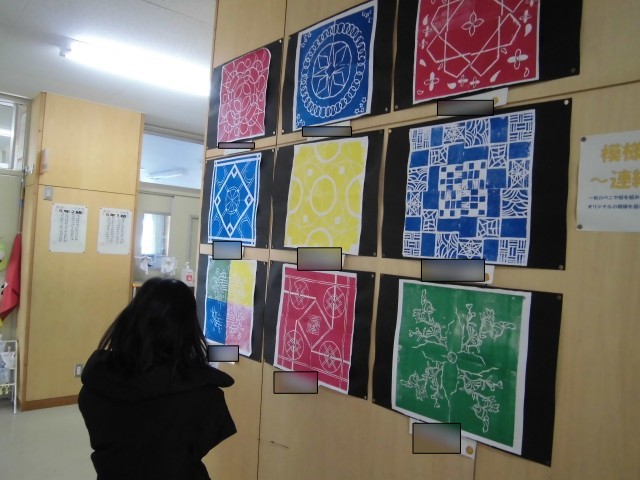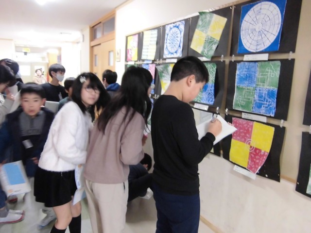 今日の図工は他のクラスの作品を鑑賞しました。模様の形や色の使い方を観察しました。