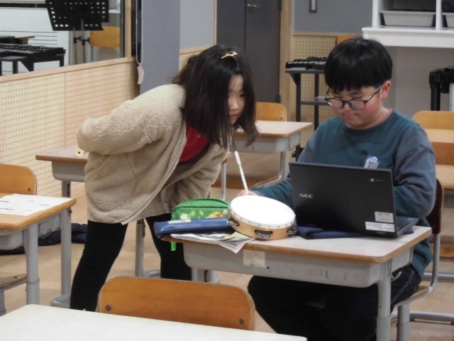 音の響きや重なり、つながりを確かめながらグループで音楽をつくりました。