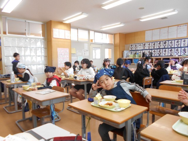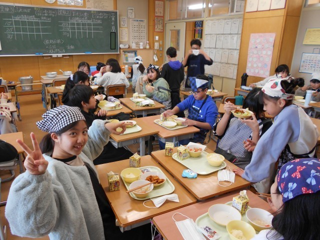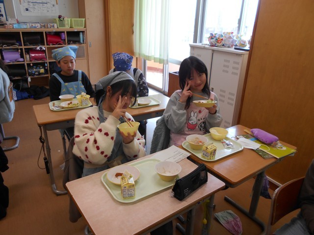 今日の給食のおかずにはいかの唐揚げがでました。休日にあった出来事を話しながら楽しく給食を食べていました。