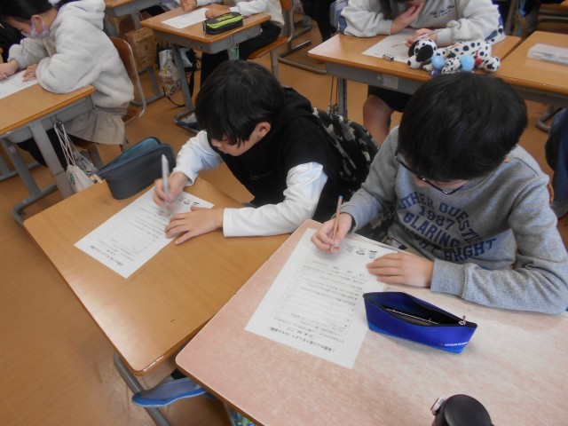 教室で1年間の避難訓練を振り返る活動をしました。各自、自分がどんなことをこれからも気をつけていきたいかを書き記し、来年度に活かそうとする姿が見られました。