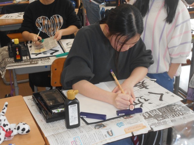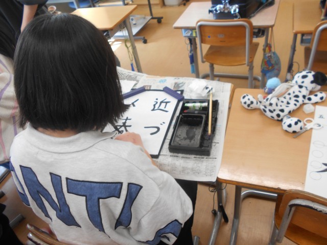 書写の時間では「近づく春」を書いています。見本を見ながら「止め・はね・はらい」に気をつけて書いていました。