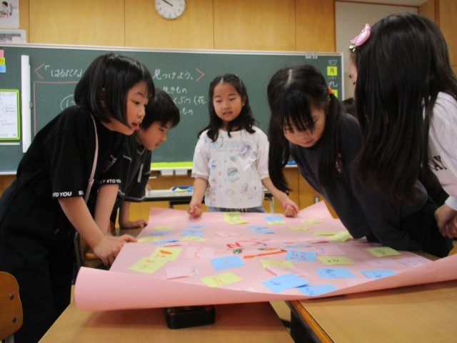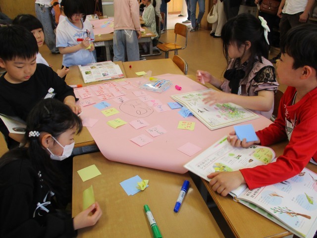 国語科の「春がいっぱい」の学習で、グループに分かれて、「春だな」と感じる言葉を探し、付箋に書いて、模造紙に貼る活動をしました。季節の本を見ながら、たくさんの言葉を見つけていました。