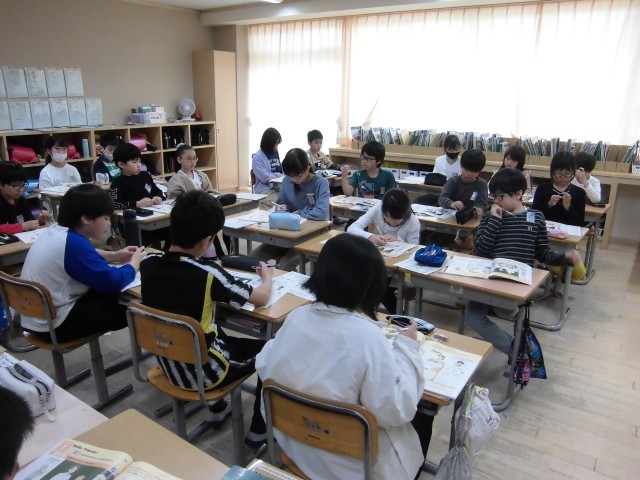 外国語科の学習が始まっています。歌を歌ったり、英語の会話を聞いて分かったことをメモしたりしていました。