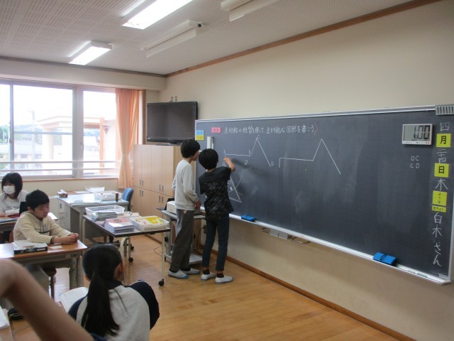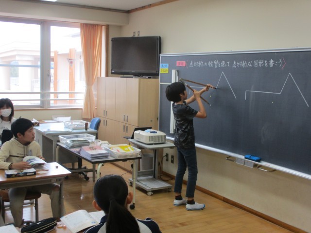 友達に教わった点対称な図形の書き方を、クラスのみんなにも紹介しました。