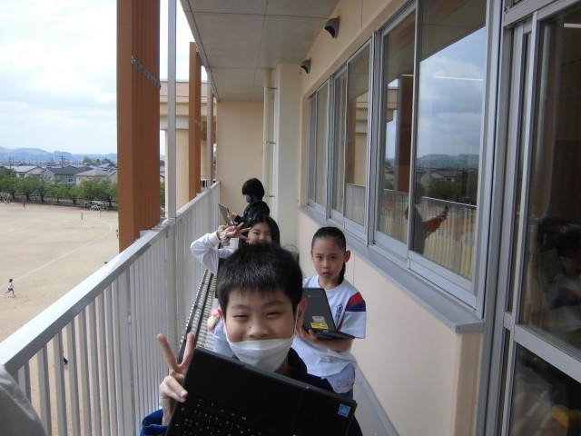 休み時間に、空を撮影している様子です。雲や天気について関心をもっています。