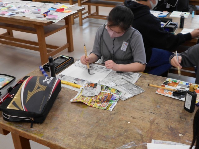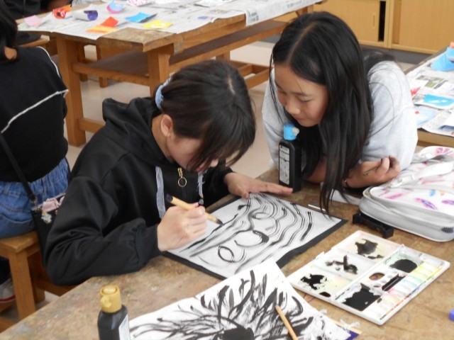 想像を膨らませながら、思い思いに水墨画を描きました。模様や生き物、風景など様々な作品ができました。