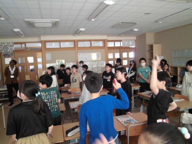 外国語の授業の様子です。踊りながら元気よく歌っています。
