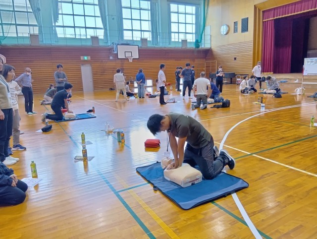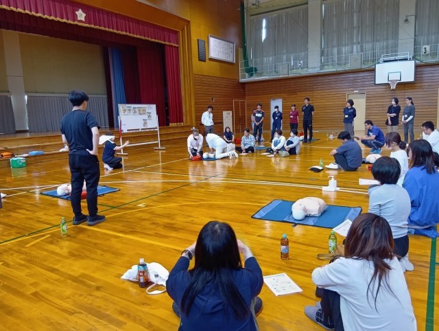 健康安全部です 公開日 2025/05/26 更新日 2025/05/24 速小ニコニコPTA 5月23日(金)救命救急講習会に参加しました。2名の救急法指導員をお招きし、心肺蘇生やAEDの使い方を教えていただきました。プールや海で溺れた人の救命方法を教わった後、各グループに分かれて一次的救命処置の練習を行いました。実際にやってみると、胸骨圧迫は一人では長時間できないことがわかり、周りの人の協力も重要であることを知りました。7月には健康安全部で、3年生の水泳教室をお手伝いする予定です。
