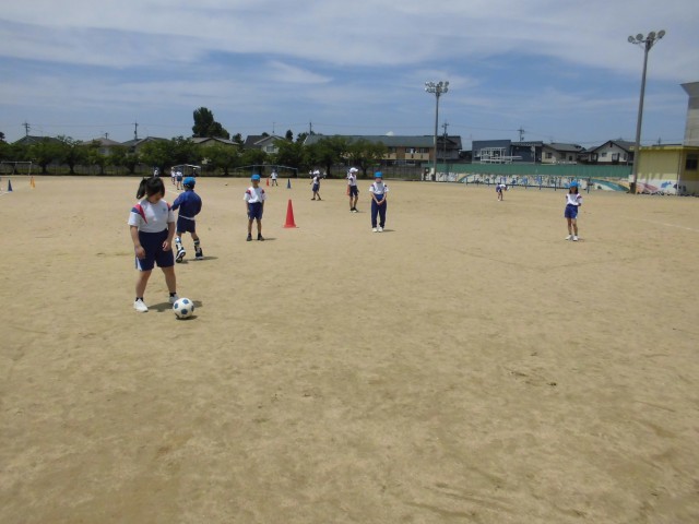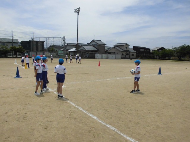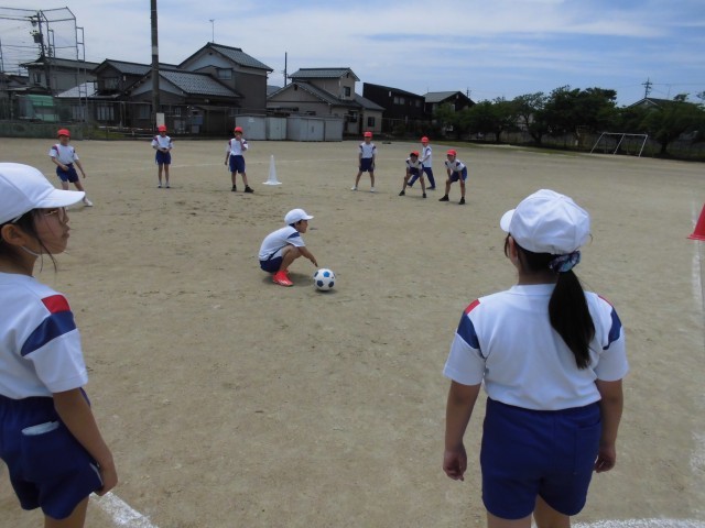 2年生の頃のTボールの学習を活かしながら、ボールを足で蹴る運動に取り組んでいます。