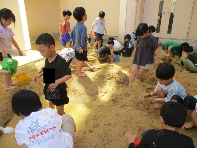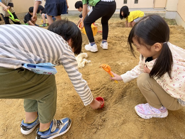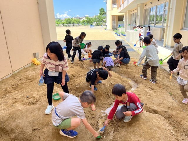 川を作り水を流したり、土を固めて泥団子を作ったりするなど、子供たちはとても楽しそうでした。