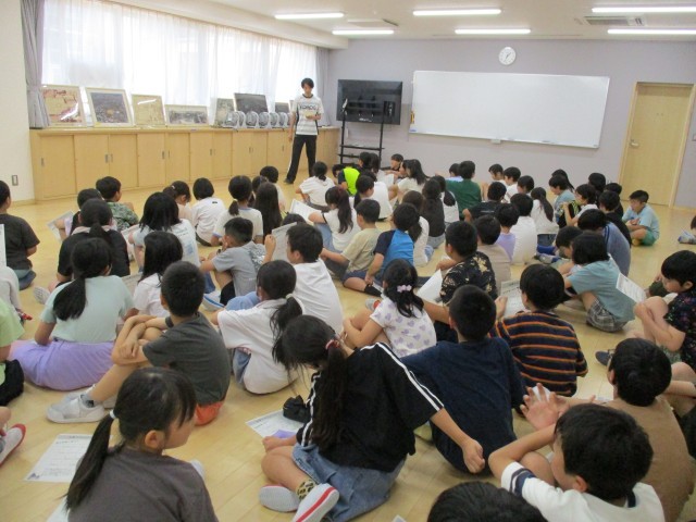 4年生の学年集会で、宿泊学習についての話を聞きました。