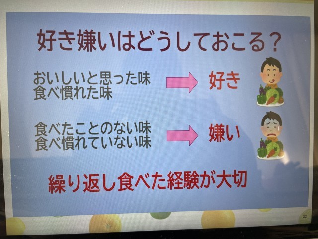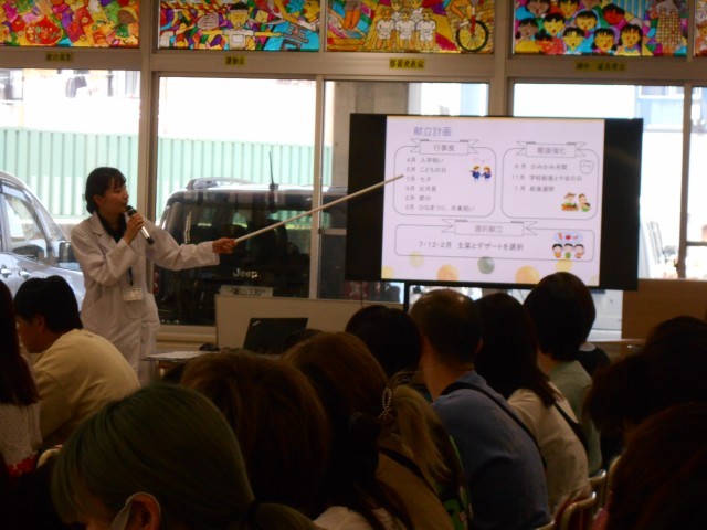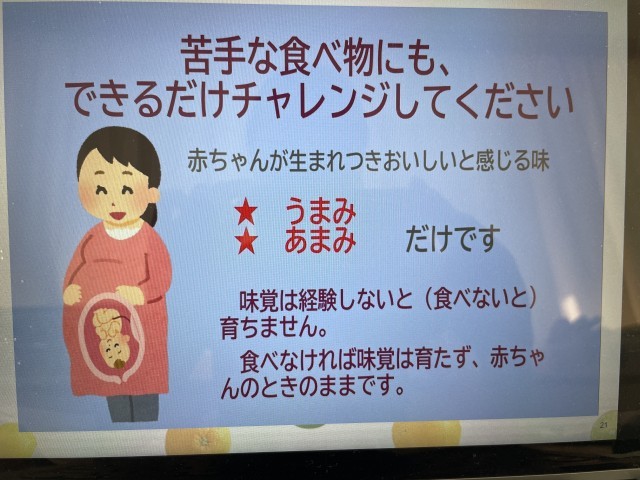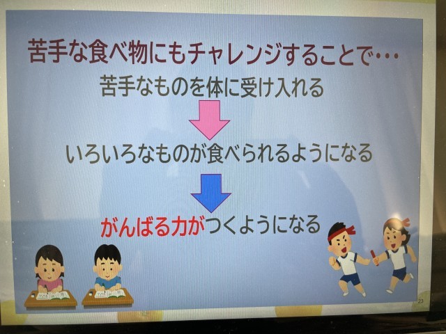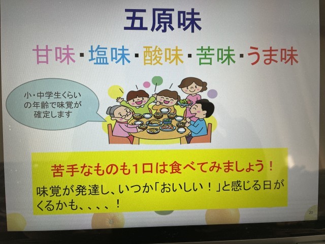 栄養教諭の話では、富山市の学校給食の話やマナー、給食ができるまでの給食室の様子をパワーポイントや調理器具を使って紹介しました。1年生ということで好き嫌いも多いと思うので、この機会に味覚の話をさせていただきました。1口挑戦することでいろんな味覚が発達し、いつか苦手な物も食べられるようになったら嬉しいなと思います。