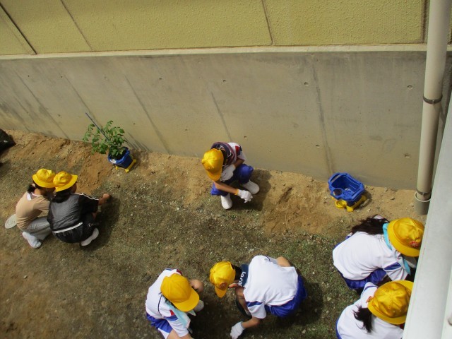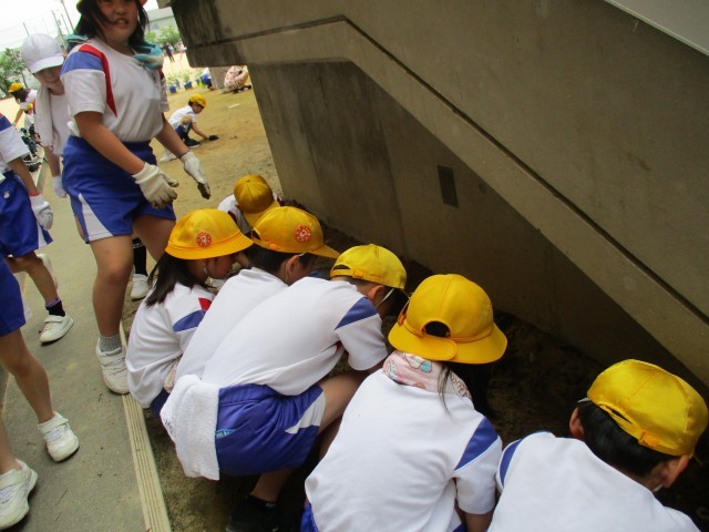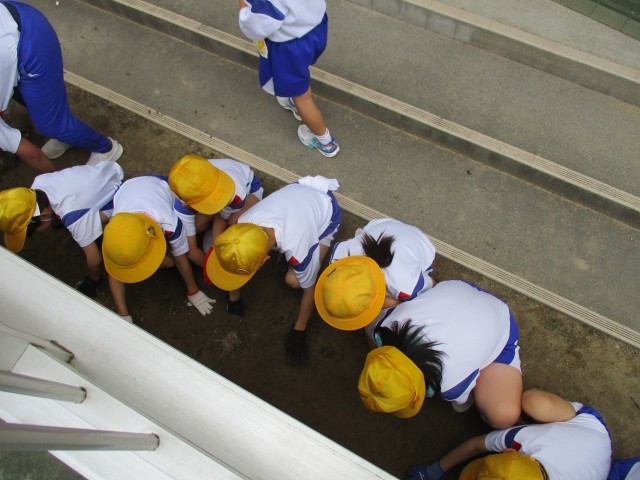 プールの周りの草むしりをしました。小さな雑草も協力して抜いて、きれいになりました。