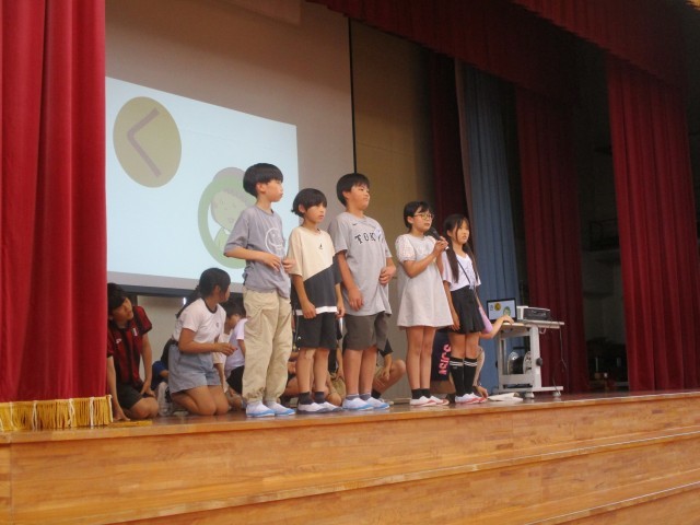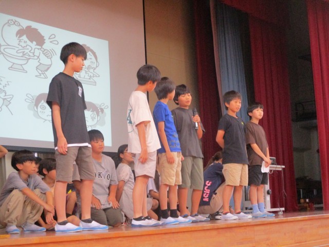 プール開き式の時にスポーツ委員会がプールに入るときの注意を全校に伝えました。