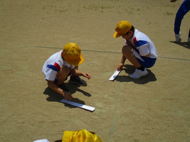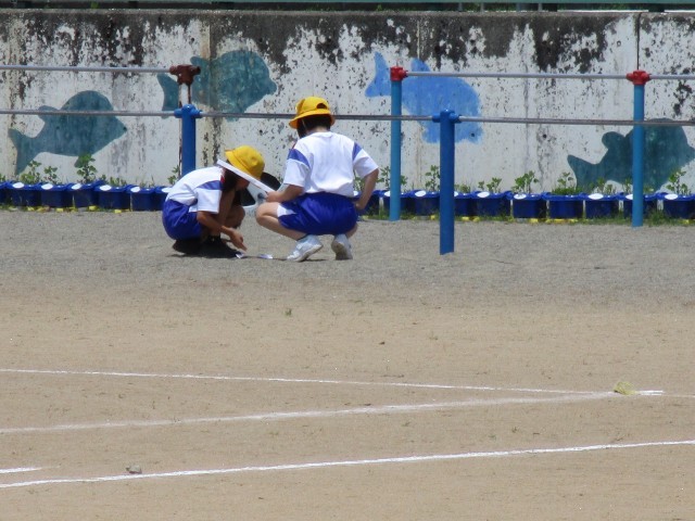 ビー玉を転がして、校庭の水が流れていくところを確認しました。