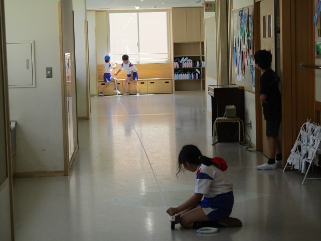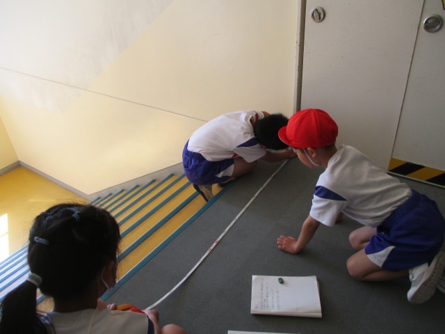 友達と協力しながら、巻き尺を使って、学校内のいろいろな物の長さを測りました。