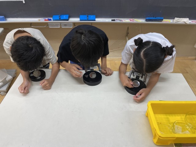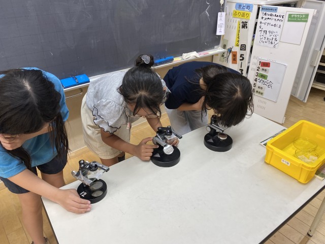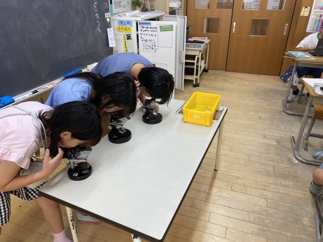 理科の授業でメダカの卵の観察をおこないました。顕微鏡を上手に調節して、卵の観察をしていました。