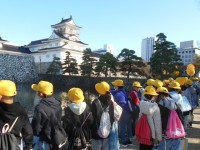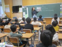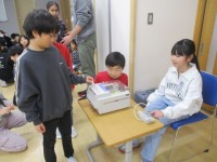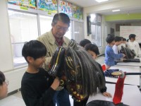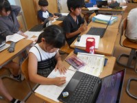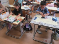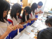作品の色付けをしています。筆の太さや色の濃さを変えながら、工夫して活動しています...