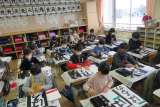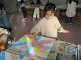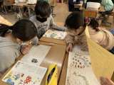 「全集中!」 真剣な顔、顔、顔。 書き終えた作品は、すぐに廊下に掲示しました。