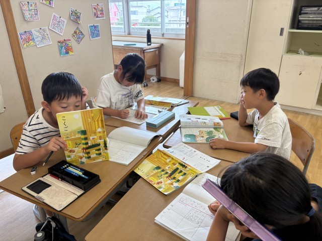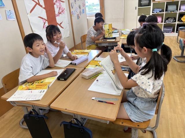 「ことばでみちあんない」の学習をしました。グループの友達に電話をかける設定で、教科書の挿絵にある待合せ場所を伝えていました。聞いている人は、一生懸命ノートにメモをとりながら、友達が指定した場所を予想していました。友達の話によく耳を傾けている子供たちでした。