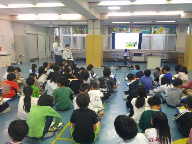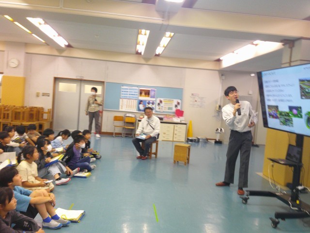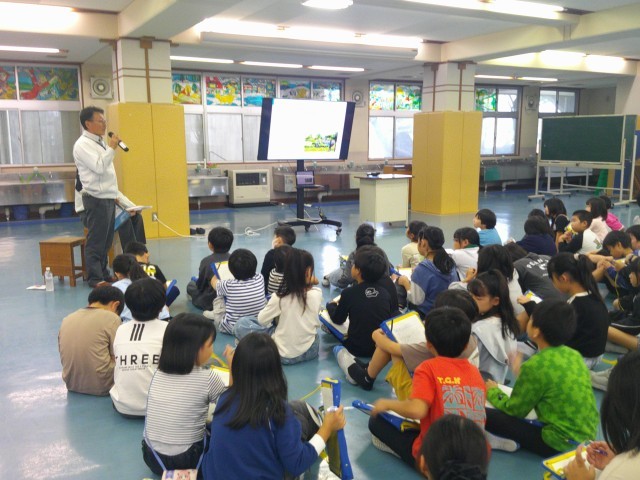 日産化学の方々に来ていただき、「鵜坂地区の自然を守るためにどんなことをしておられるか」について話をしていただきました。日産化学の取り組みの一つとして日産ビオパークを管理しておられること、自然が大好きなボランティアの方々によって支えられていることなどを学びました。これから、学んだことをもとに、自分たちにできることを考えていきます。