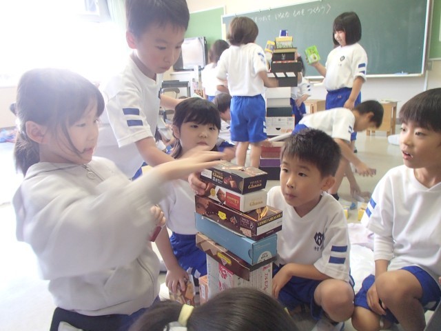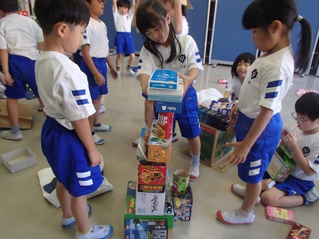 「高く積むには、箱をどうやって重ねたらよいかな」「平べったい箱を使って滑り台をつくろう」など、子供たちのたくさんの工夫でいろいろなものができました。