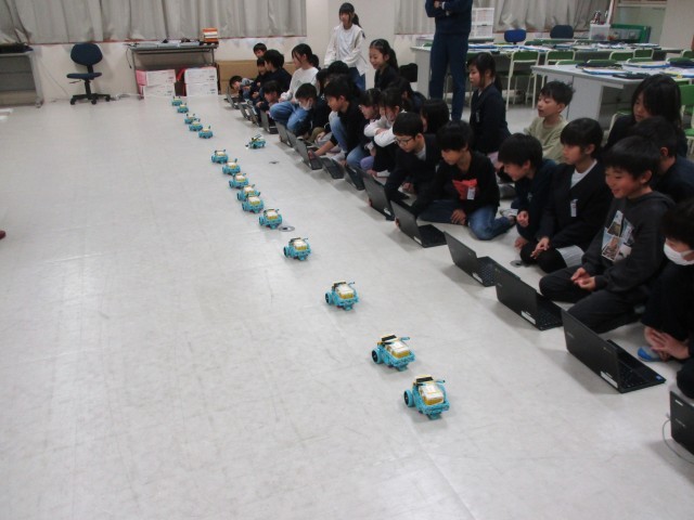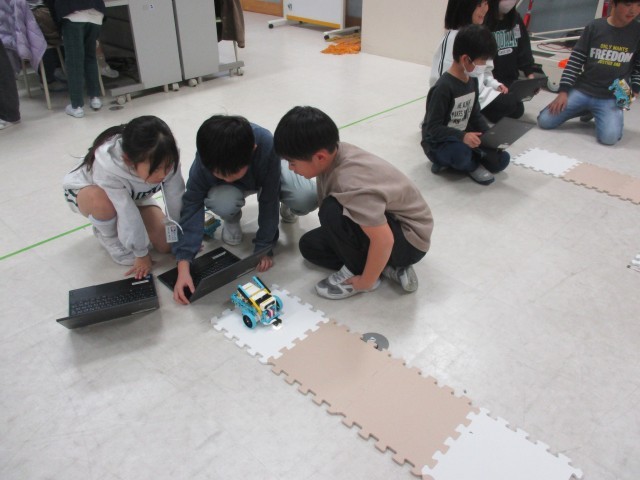 3年生のプログラミング学習では、自動走行ロボットを取り上げ、ロボットの車を動かすプログラムを組むという学習を行いました。最初に講師の先生がつくられた「ルービックキューブ揃えロボット」を鑑賞しました。見る→考える→動かすの3つの要素を生かして、ルービックキューブがあっという間に揃い、感心する3年生でした。今年からクロムブックでロボットを操作できるようになったので、その操作を確認した後、待ちに待ったプログラミングに取り組みました。コースを何cm進んで曲がるか、止まるか、アームを下げるかを考えながら、ペアで話し合い、プログラムを組んでいきました。中々思うように車が動かず、「あーもう5cm進まないと。」「野菜を降ろすところが飛んで行った。アームが逆だ。」とあちこちで悔しそうな声が聞こえてきました。でも、どの子もあきらめませんでした。「失敗するということはいいことなんだよ、次にどうしようか考えることにつながることなんだよ」という講師の先生の言葉を胸に、どの子も最後まで一生懸命活動に取り組みました。
