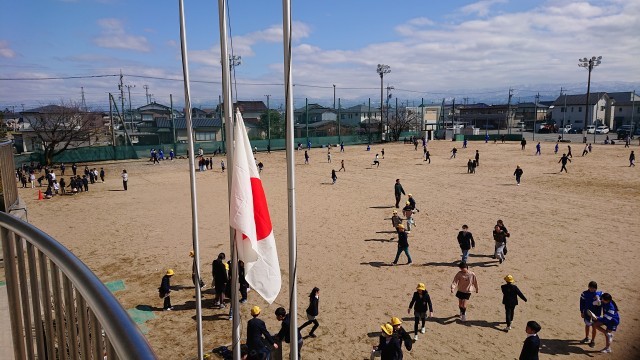 昨日の雪が嘘のように気持ちのよい晴天のもと、グラウンドではたくさんの子供たちが遊んでいました。おにごっこをするクラス、ボール遊びをするクラスなど、クラスごとに楽しそうにしていました。