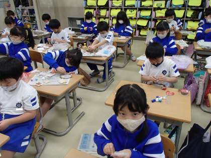 先週は2組と3組、今日は1組と4組が、アサガオのつるを使ったリースづくりを行いました。自分の持ってきた材料や秋の実を使って、一人一人思い思いに作品を仕上げました。