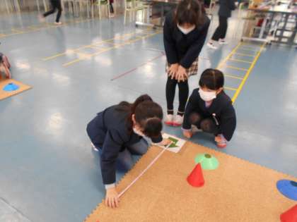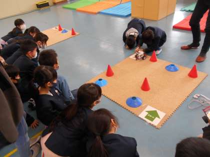 3年生は、地域の方を講師としてお招きし、プログラミング学習を行いました。今日は、ロボットがスタート地点からゴール地点まで到着するプログラムを考えました。ゴール地点に到着させようと、友達と協力しながらマット長さを測ったり、曲がる角度を何度も変えたりするなど、試行錯誤しながら学習に取り組みました。