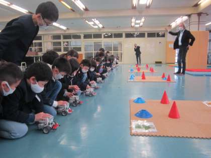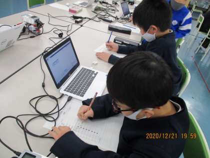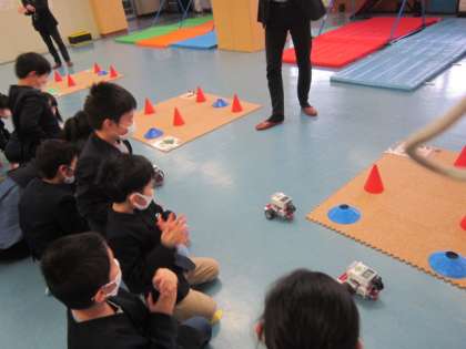 今日は3組と4組がプログラミング学習をしました。「災害被災者を救出しよう」「救出した被災者を病院に運ぼう」というミッションを遂行するために、どんなプログラムを組み立てればよいかをペアで考えました。
