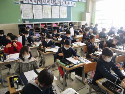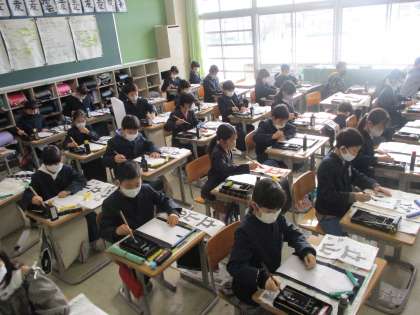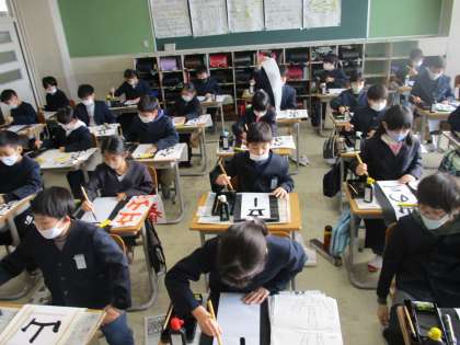 今日は書き初め大会がありました。冬休みでの練習の成果を十分に生かし、力強い文字を書くことができました。