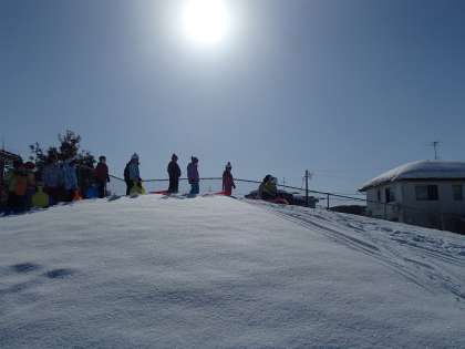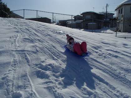 築山ではそり遊びをしました。てっぺんからいきおいよく滑り降りるのが楽しくて、「もっと滑りたい」という声も聞かれました。全員2回ずつ楽しむことができました。