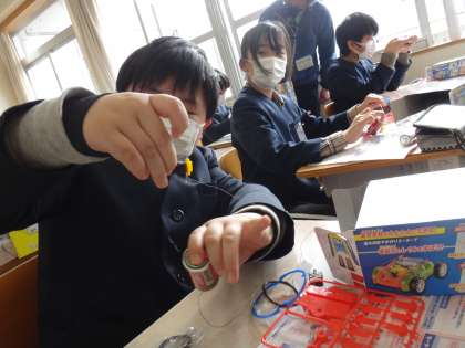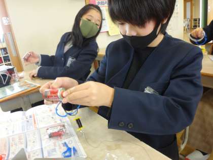 理科の学習で、電磁石の性質について調べています。今日は、コイルに鉄芯を入れ、電流を流しました。すると、鉄芯に釘がたくさん付く様子が見られ、子供たちは電磁石の性質に驚いていました。