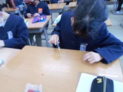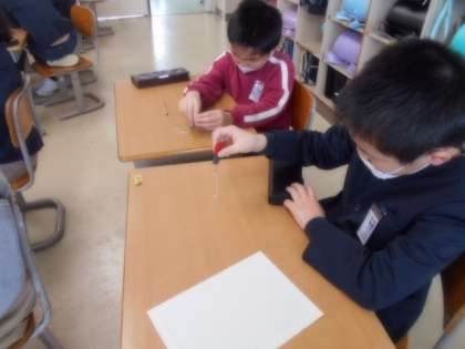 今、理科の学習では磁石の性質について調べています。「磁石はどんな物を引きつけるのかな」「磁石と磁石を近付けると何か手応えがあったよ」など、視線を磁石の先に集中させて真剣に調べています。長い時間磁石に付いていた釘が他の釘を引きつけるなどの不思議な現象に出会った時には、あちらこちらから歓声があがります。自分で発見することが楽しいのですね。