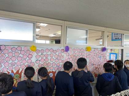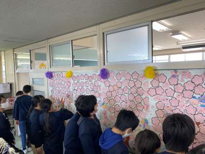 今日、5年生のみなさんが、各学年でつくってくれたお祝いメッセージ持って、6年生の各教室に貼りに来てくれました。メッセージを読んだ6年生はとてもうれしそうでした。1年生から5年生のみなさん。本当にありがとうございました。