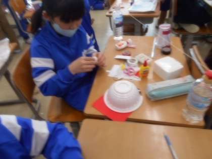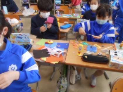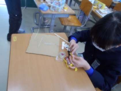 理科では、今までに習った電気や磁石、ゴム等のはたらきを利用したおもちゃをつくっています。動画でつくり方を調べたり、おもちゃの動きを何度も確認したりしながら、集中して取り組んでいます。できあがったら友達と遊ぶのを楽しみにしています。