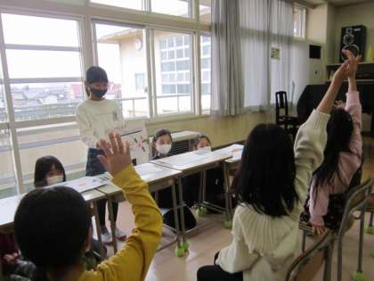 今日は3年4組が2年生に、これまでの学習のまとめを発表しました。これまで調べたことや実践したことを、分かりやすいように資料を見せながら伝えました。発表を聴くばかりでは飽きるだろうと、クイズを工夫した子もいました。また、自分で写真を撮って、2年生に見せていた子もいました。相手のことを意識して、表現の仕方を考えることができました。