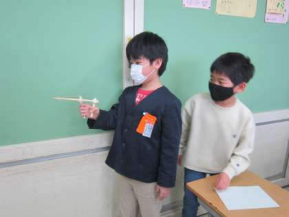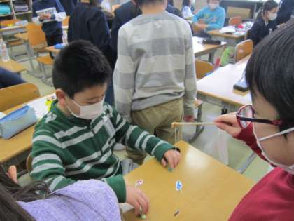 先週、電気やゴムや磁石を利用したおもちゃをつくりました。今日は、自分のおもちゃの仕組みを説明し、遊んでもらいました。また、友達のつくったおもちゃで遊んだり、仕組みを聴いたりもしました。