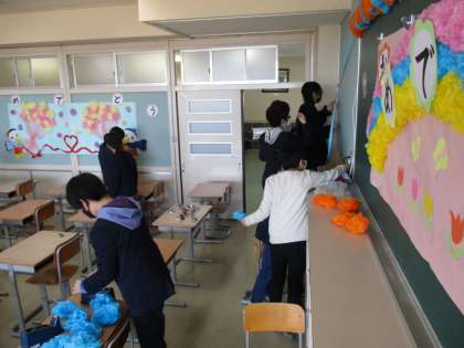 6年生教室の飾り付け、各場所の清掃を丁寧に行いました。
