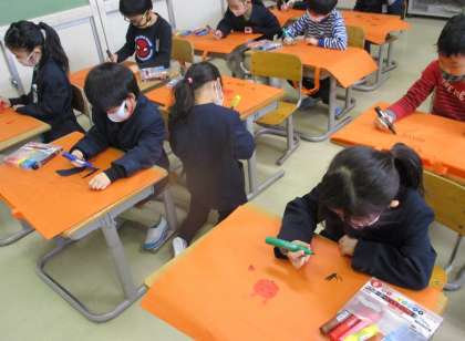 みんなが大好きな図工の時間。最後は、「にょきにょき とびだせ」と、作品バッグにお絵かきをしました。