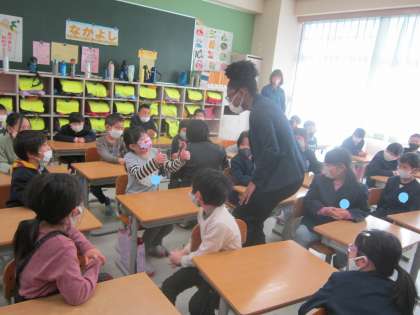 先生から「How are you?」と聞かれると、一人一人、教えていただいた英語で元気に「I’m Good.」と答えていました。