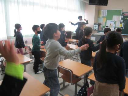 手拍子や足踏み、スゥイング等の楽しい動きを、英語で聞いたり発音したりしながら音楽に合わせて踊るのも、とても楽しかったです。